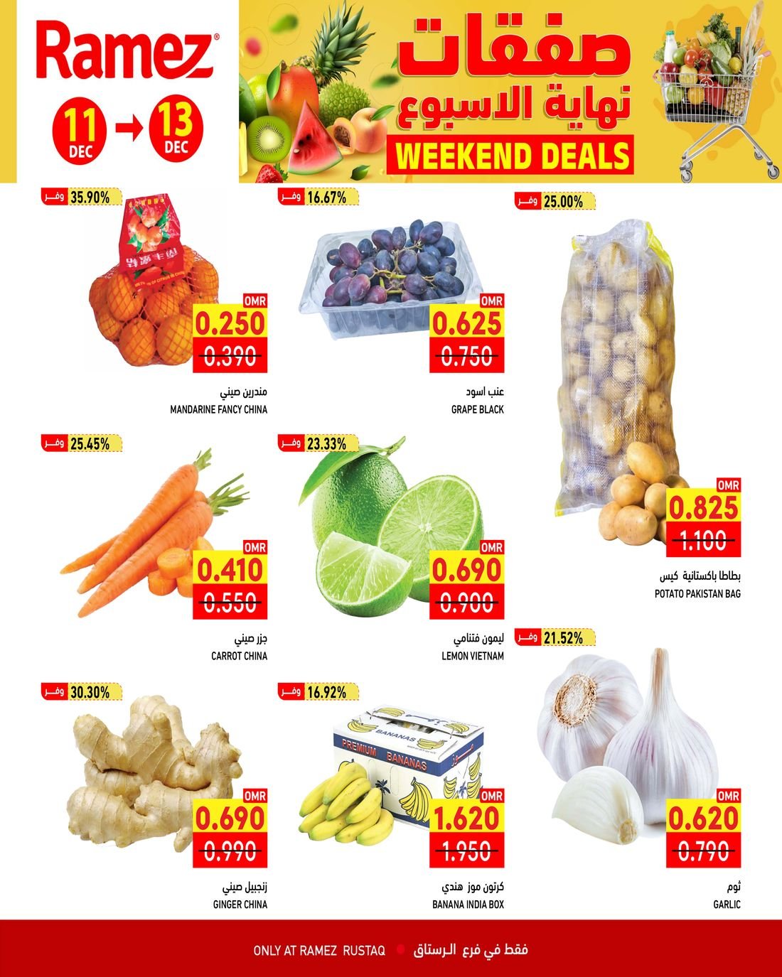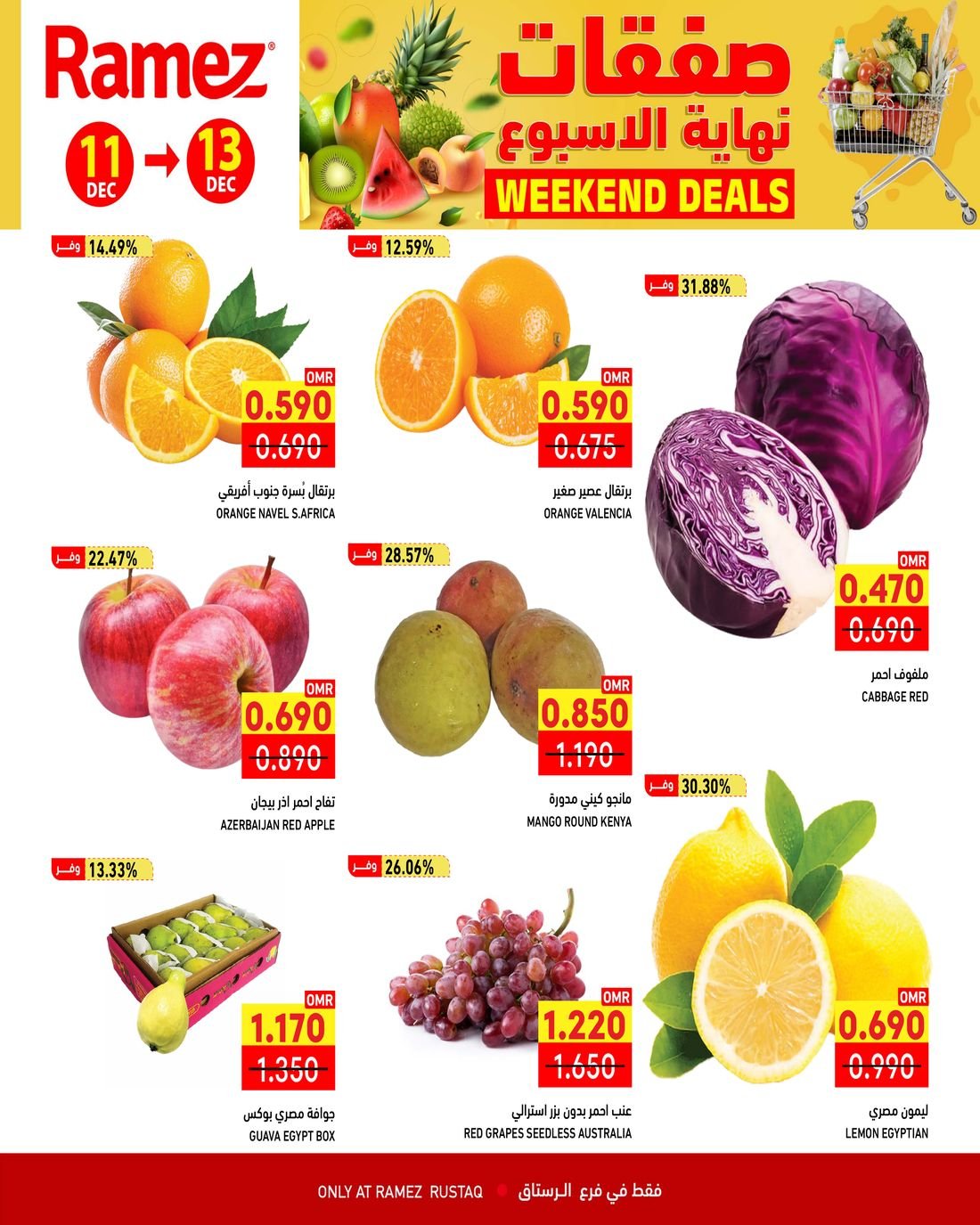 عروض المنتجات الغذائية المتنوعة من أسواق رامز عمان فرع الرستاق على الخضراوت والفواكه واللحوم والاسماك الطازجة إضافة إلى مجموعة واسعة من المنتجات الغذائية المتنوعة ضمن عروض أسواق رامز فرع ولاية الرستاق .