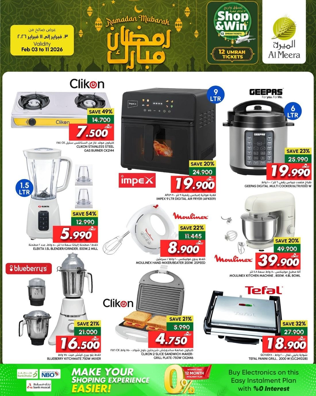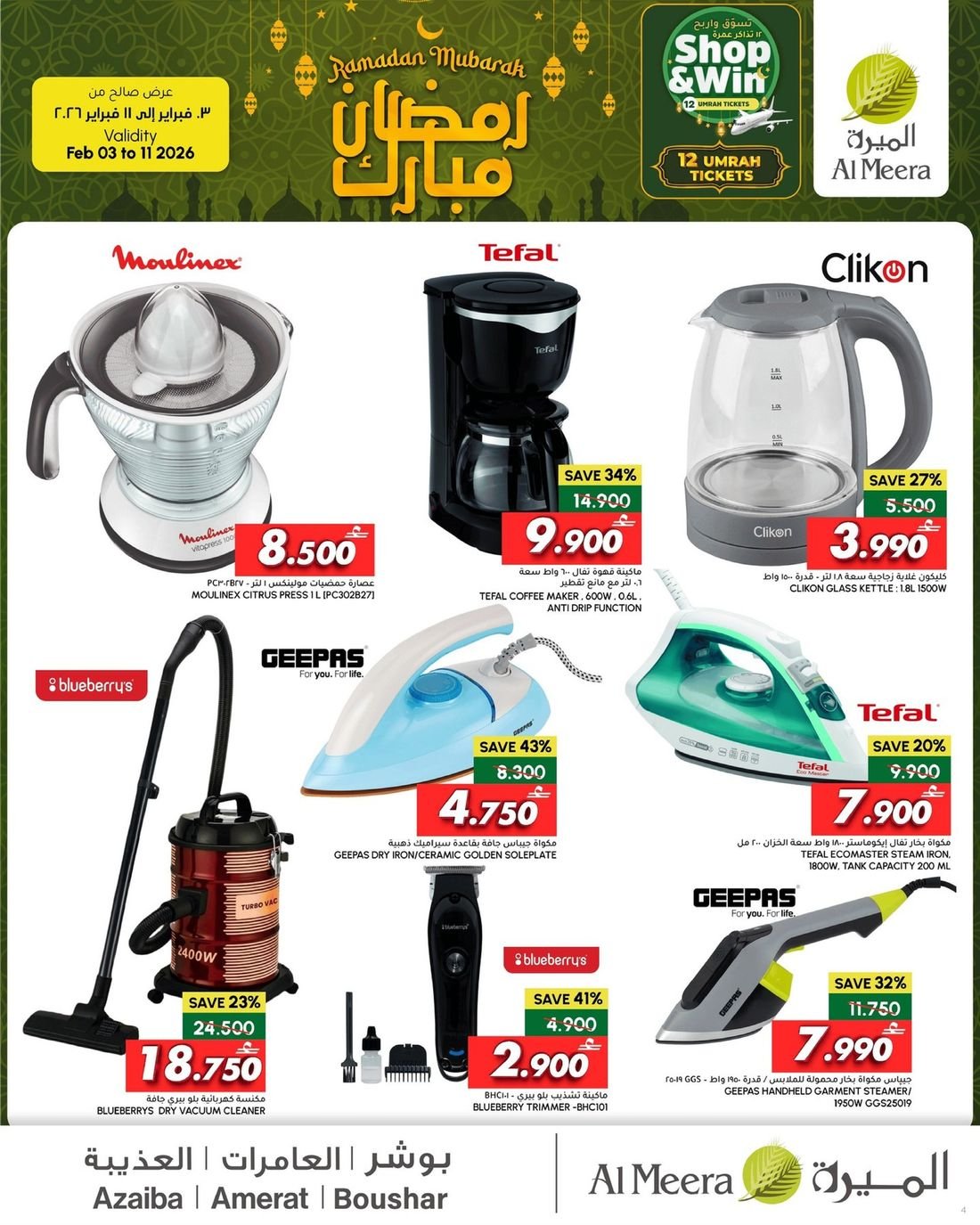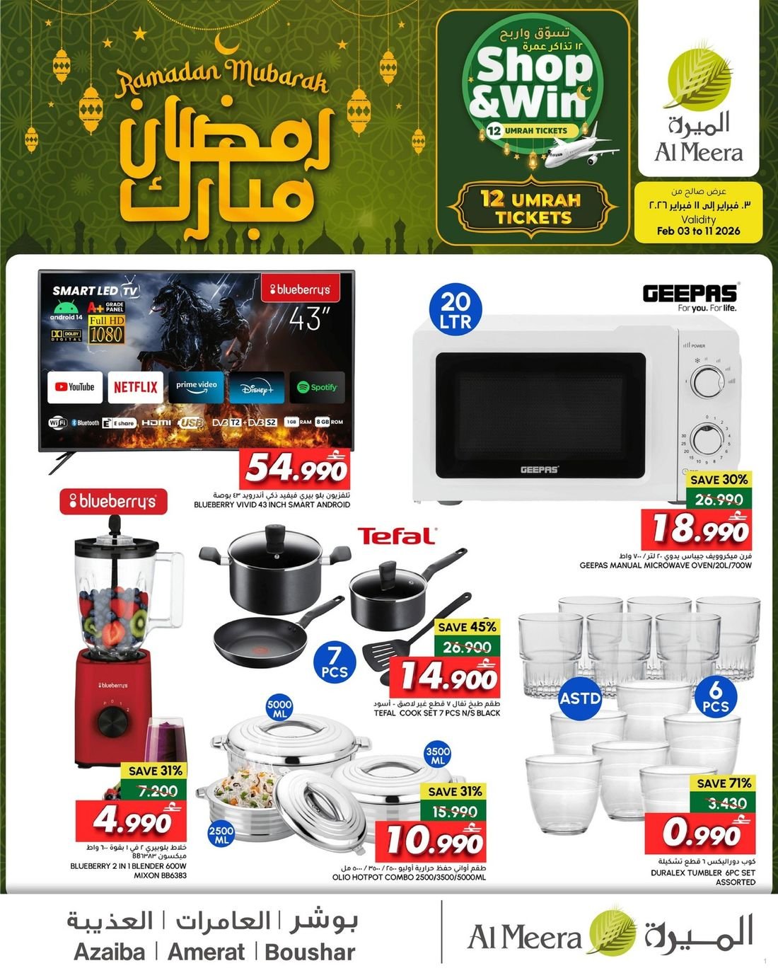 كما يشمل العرض الثلاجات والغسالات ومحضرات الطعام والقلايات الهوائية اضافة الى التلفزيونات الذكية المتوفرة الآن في فروع الميرة ماركت لتمنحك تجربة مشاهدة مميزة وجودة عالية في كل من الميرة.