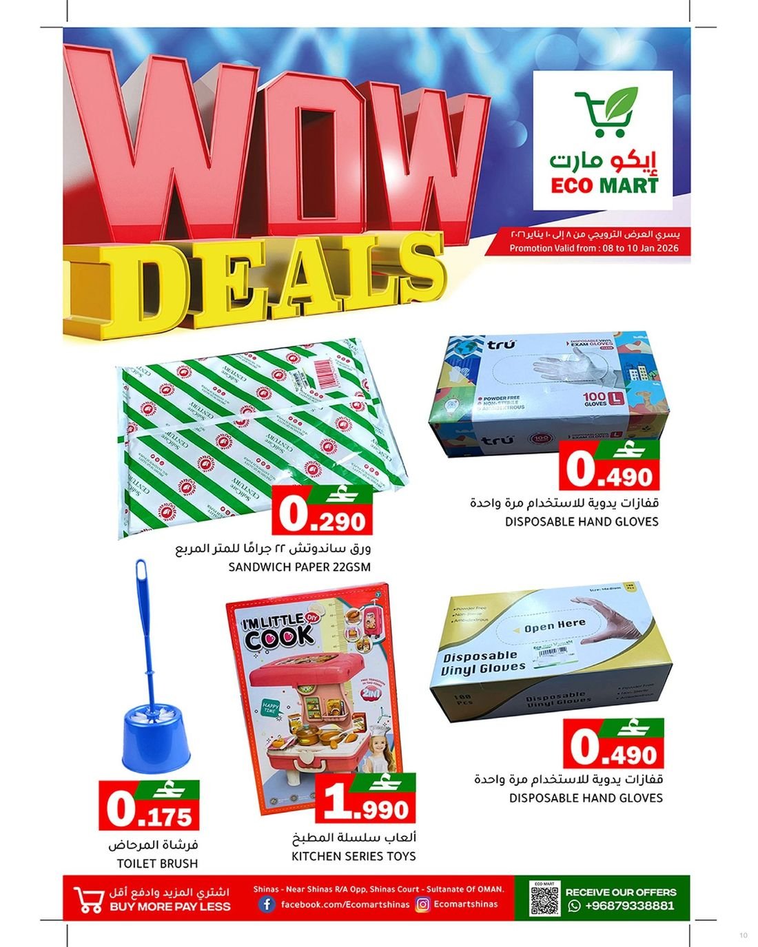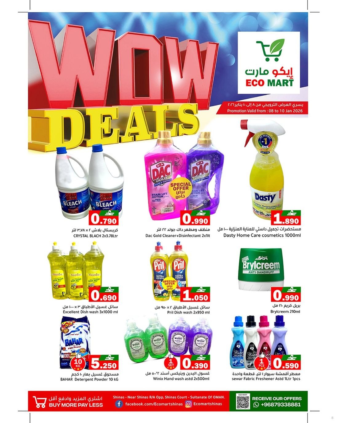 عروض كبرى من ايكو مارت في شناص على تشكيلة واسعة من الغذائيات المتنوعة ولوازم وحاجيات المنزل، كما يتوفر مجموعة متنوعة من المنظفات وادوات التنظيف والمواد البلاستيكية واواني المطبخ المتنوعة وباشكال واحجام مختلفة.