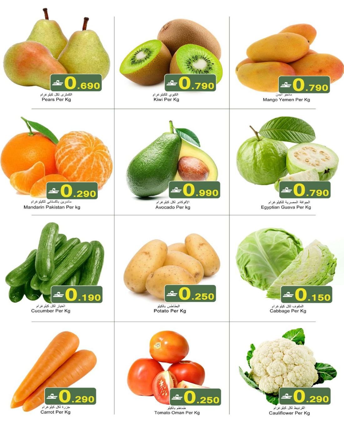 المنتجات الغذائية: خضروات وفواكه طازجة، مواد بقالة، أطعمة مجمدة، منتجات الألبان، المشروبات، والمخبوزات.