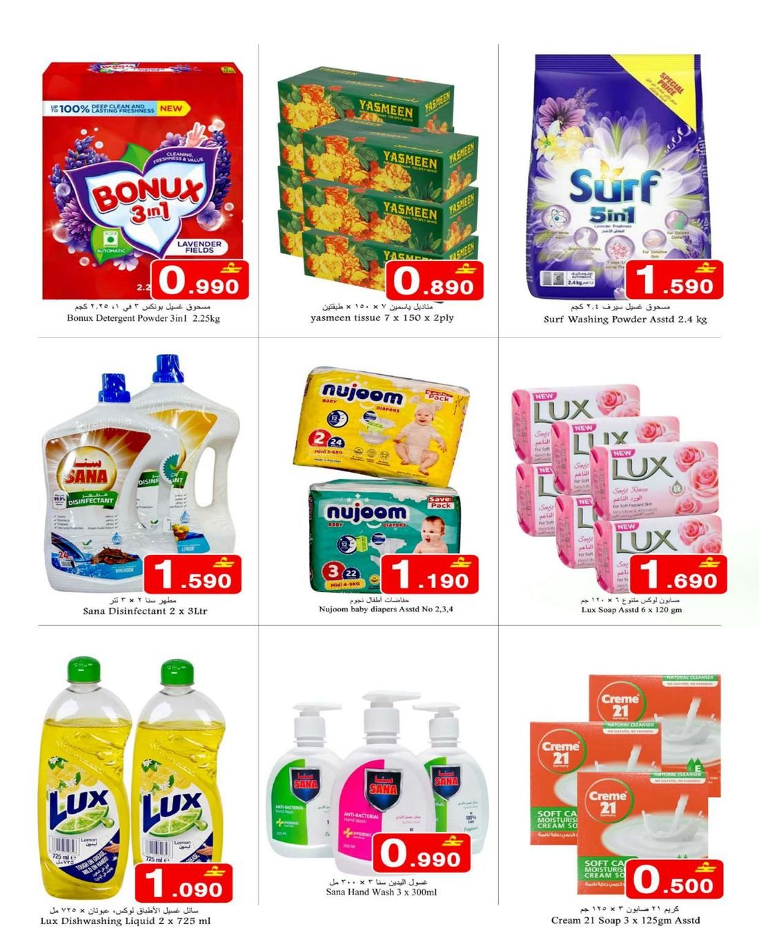 • المنتجات غير الغذائية: أدوات منزلية، أحذية، حقائب سفر، ملابس داخلية، أحذية مدرسية، وحقائب مدرسية.