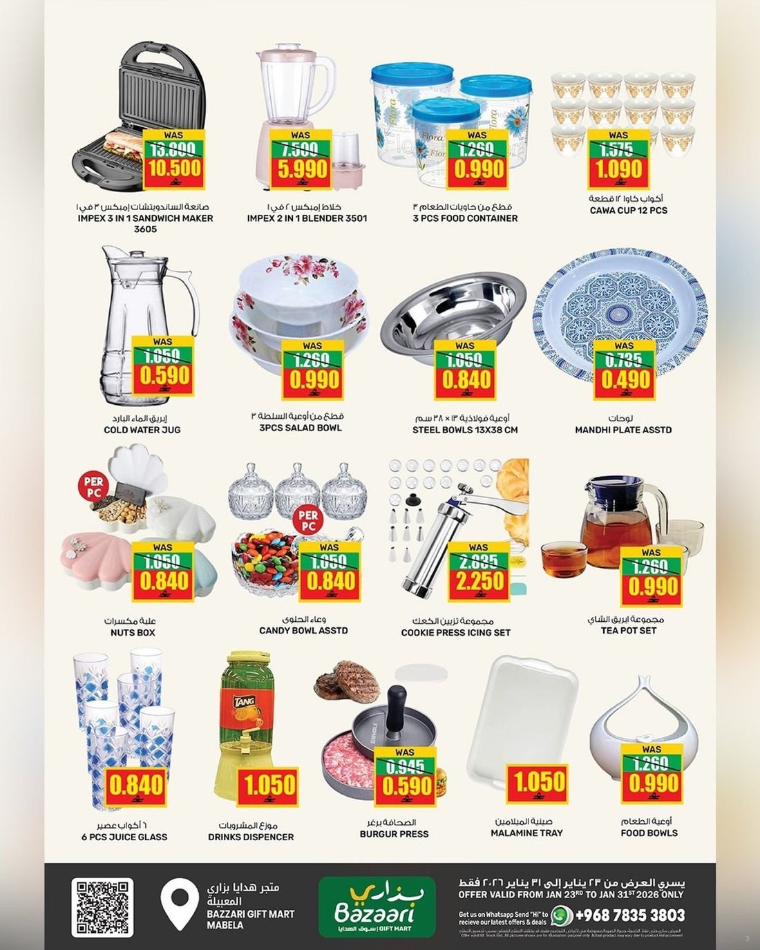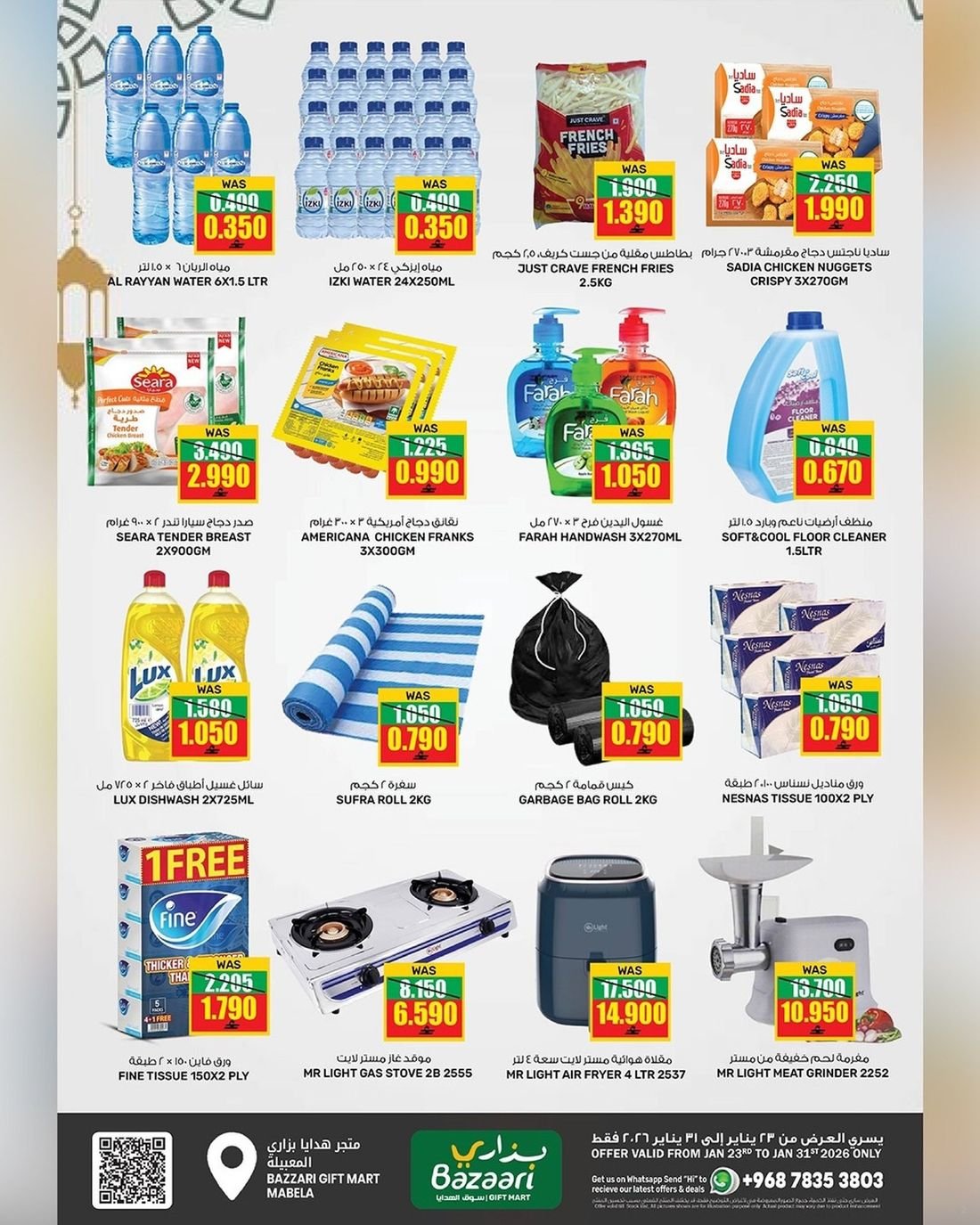 عروض الغذائيات ولوازم المنزل من متجر هدايا بزاري في مسقط المعبيلة على مجموعة واسعة من المواد الغذائية ولوازم المنزل تجدونها بأسعار مخفضة في مركز بزاري للهدايا فرع المعبيلة .
