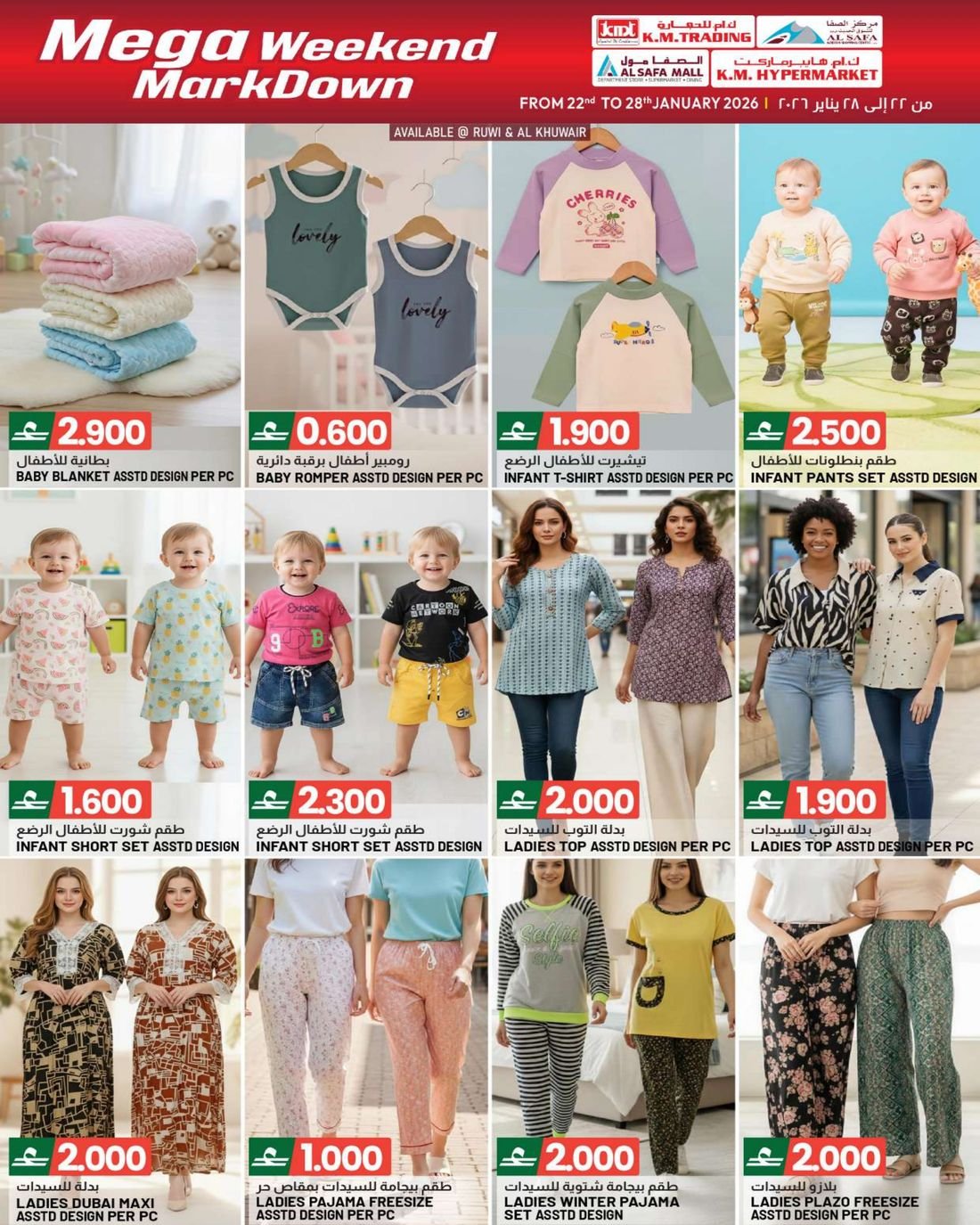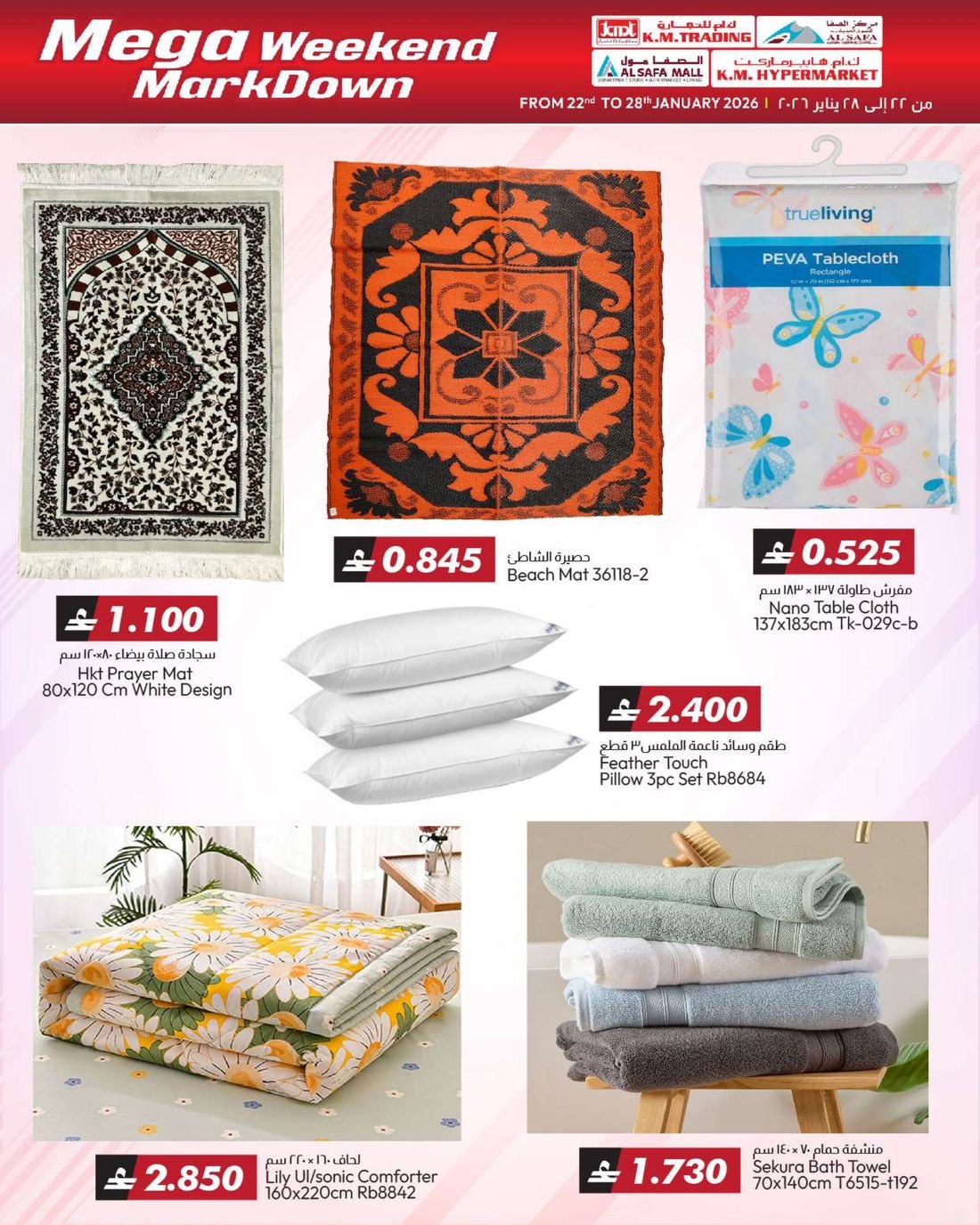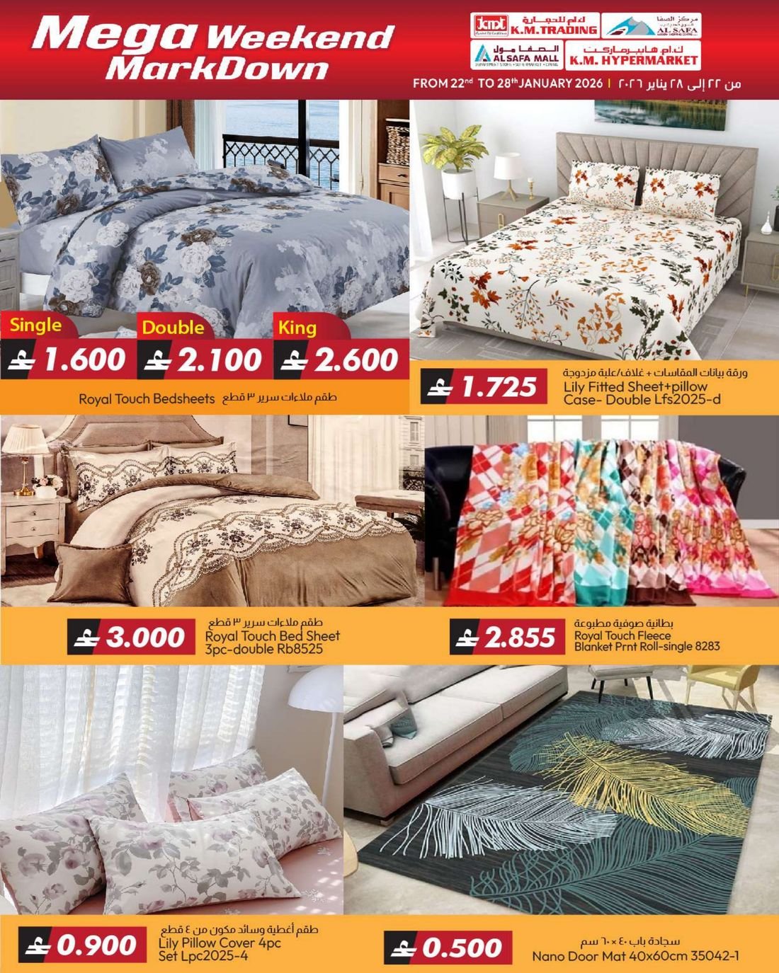 عروض الملابس المتنوعة والعاب الاطفال والمفارش من ك ام هايبر ماركت و ك ام للتجارة والصفا للتسوق، ضمن تخفيضات اسبوعية تشمل العديد من المنتجات مثل مفارش السرير والحقائي المتنوعة والمزيد من العروض الاخرى بانتظاركم، كما يشمل العرض بعض لوازم وحاجيات المنزل الاخرى.