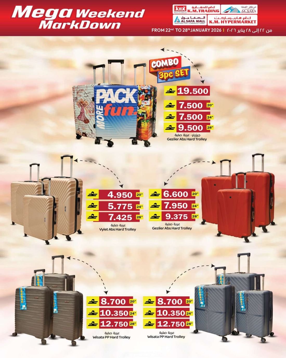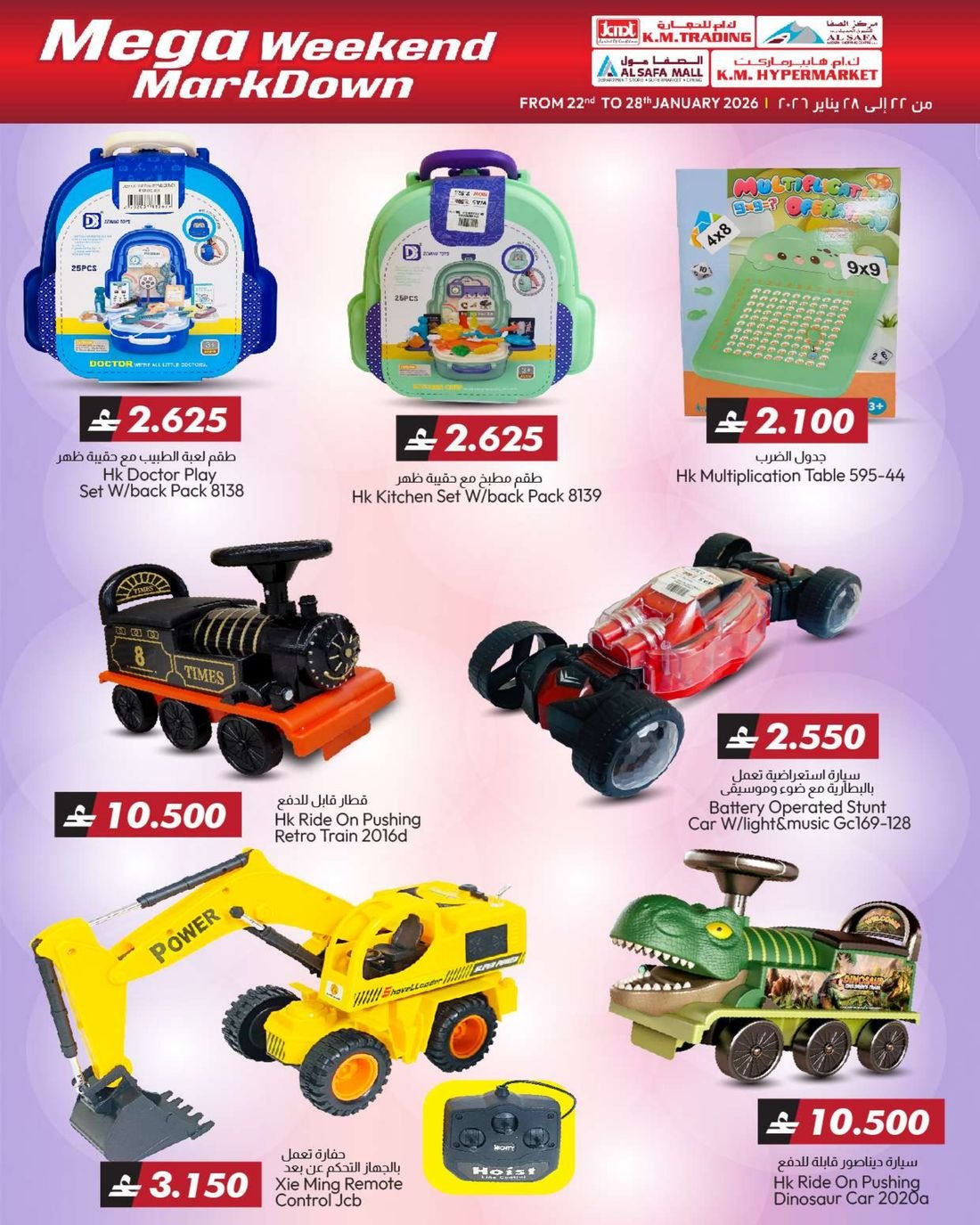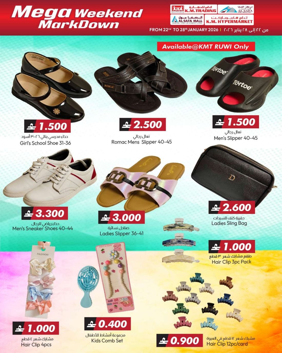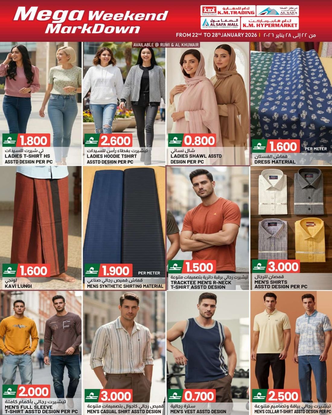 عروض الملابس المتنوعة والعاب الاطفال والمفارش من ك ام هايبر ماركت و ك ام للتجارة والصفا للتسوق، ضمن تخفيضات اسبوعية تشمل العديد من المنتجات مثل مفارش السرير والحقائي المتنوعة والمزيد من العروض الاخرى بانتظاركم، كما يشمل العرض بعض لوازم وحاجيات المنزل الاخرى.