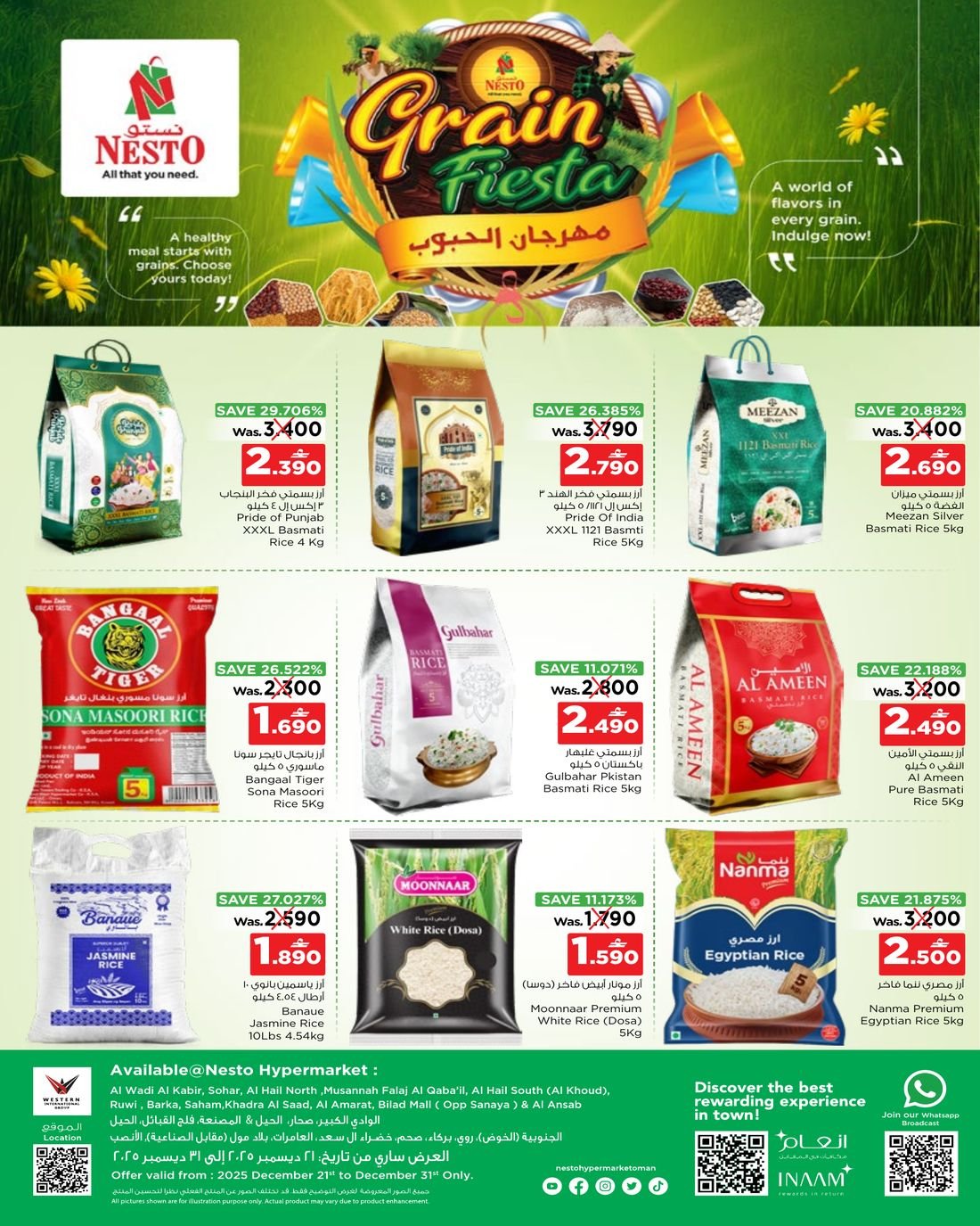 عروض الأرز من نستو هايبر ماركت في فروع روي والمعبيلة ووادي الكبير والعامرات والحيل والمصنعة والسويق وصحم وصحار والسويق وفلج القبائل وصحم وبركاء والانصب.